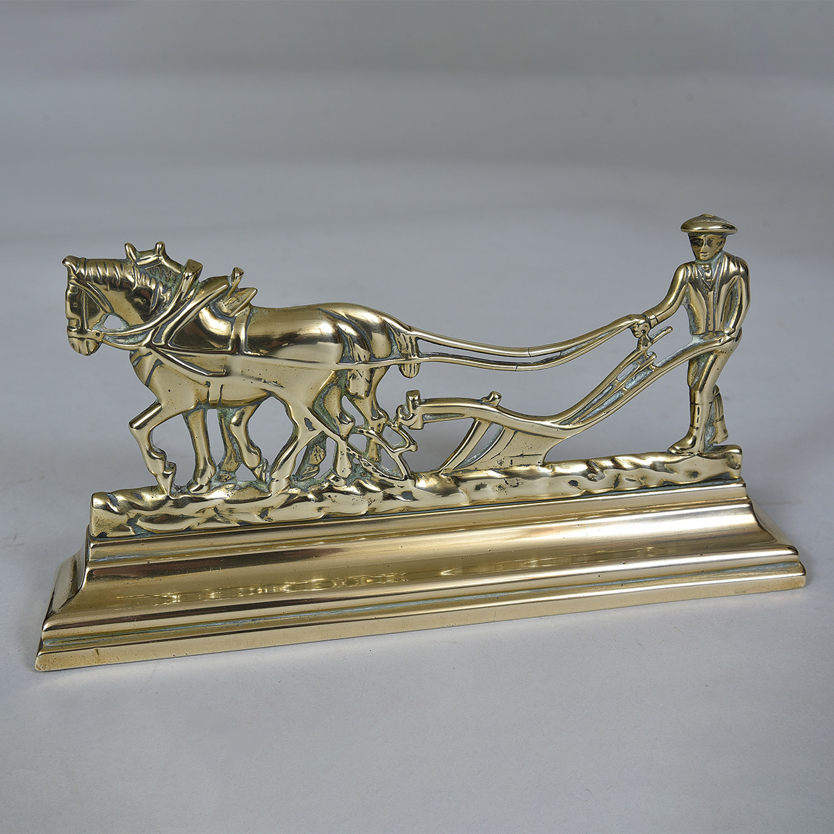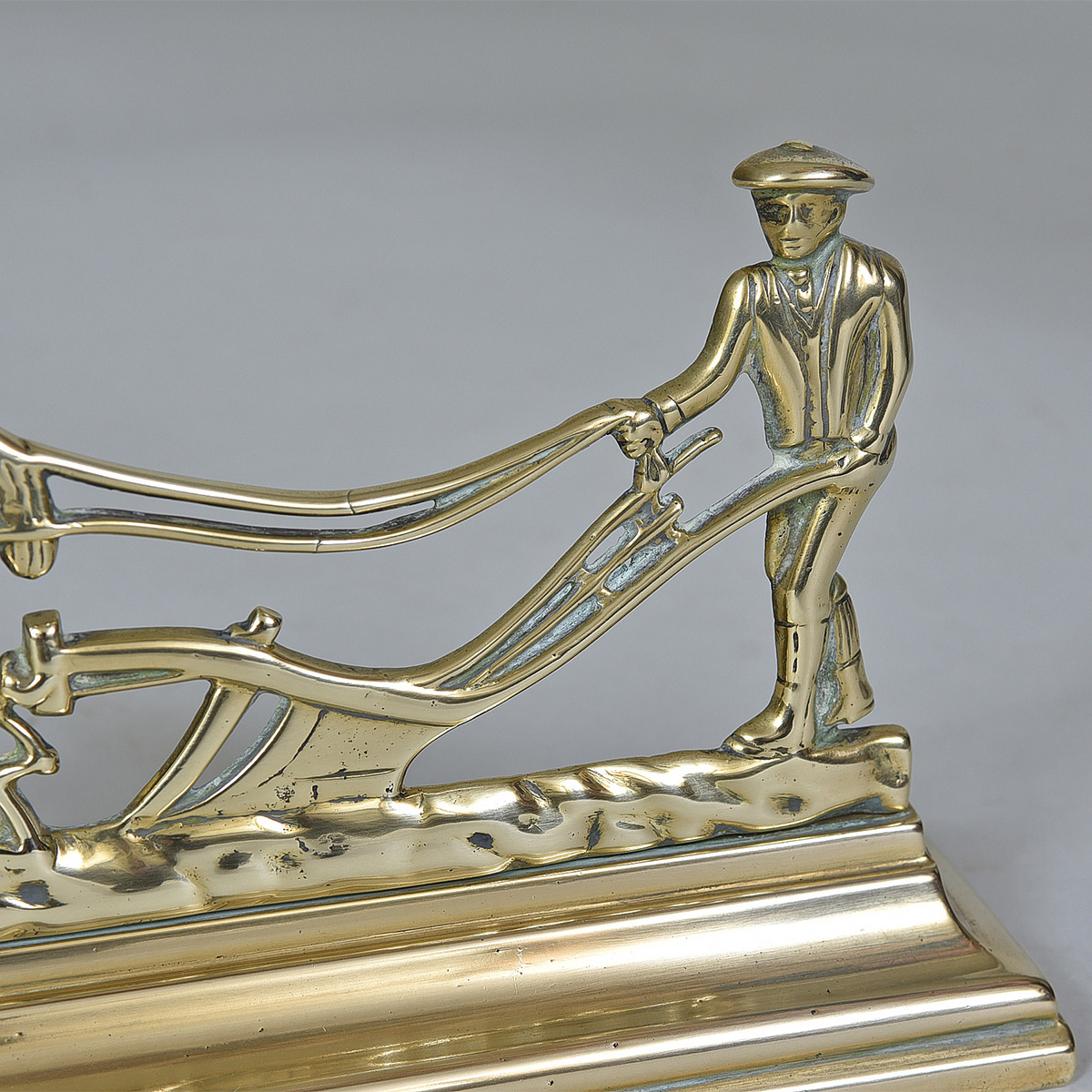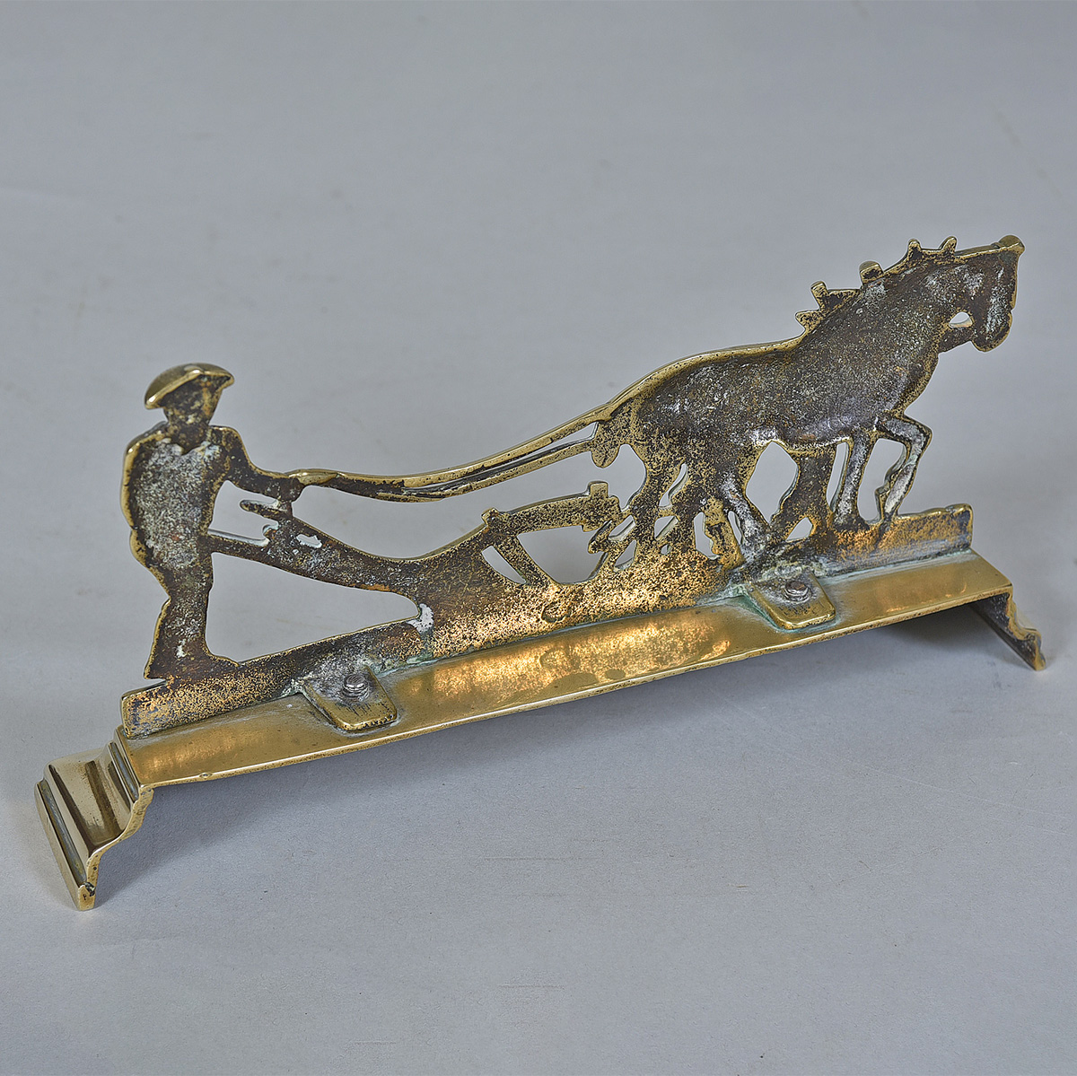 19th century brass model of a farmer ploughing Depth: 2″ / 5 cms Height: 5″ / 13 cms Width: 10.5″ / 27 cms