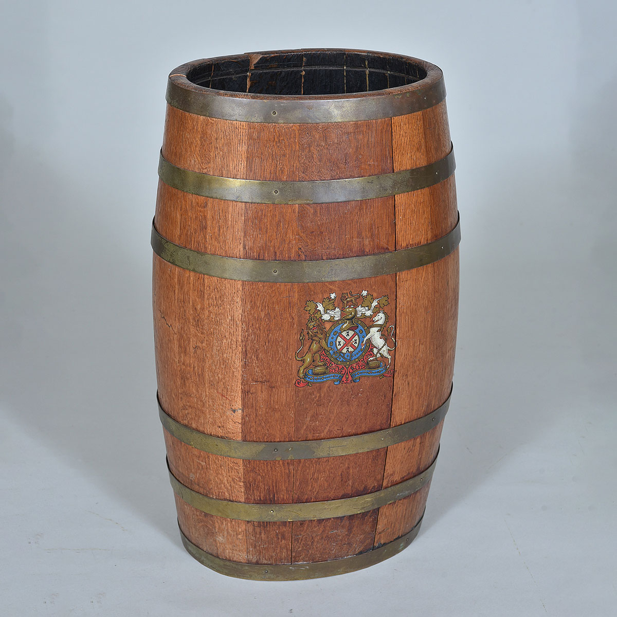 19th century brass bound, oak barrel with armourial – perfect for walking sticks and umbrellas.