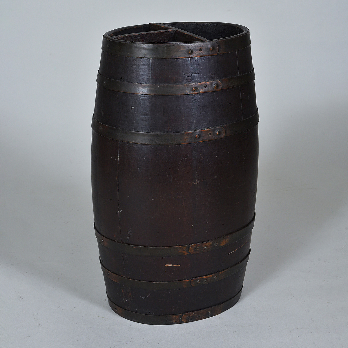 19th century Oak and iron bound stick stand or umbrella stand in good condition Width: 14.5″ / 37 cms Depth: 11″ / 28 cms Height: 26″ / 66 cms