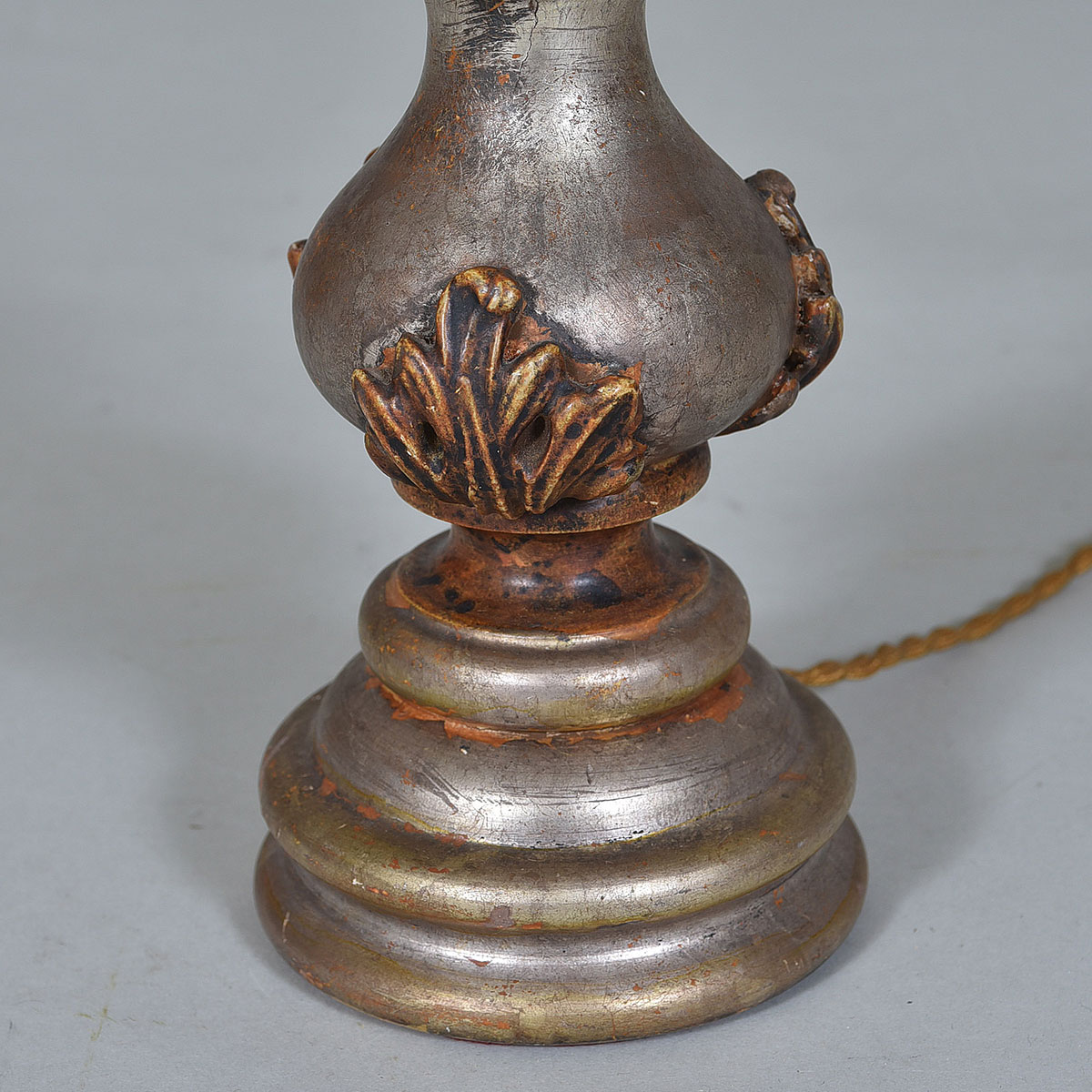 Tall hand carved lamp base with real silver leaf Height: 33″ / 84 cms Width: 12″ / 31 cms Depth: 7″ / 18 cms