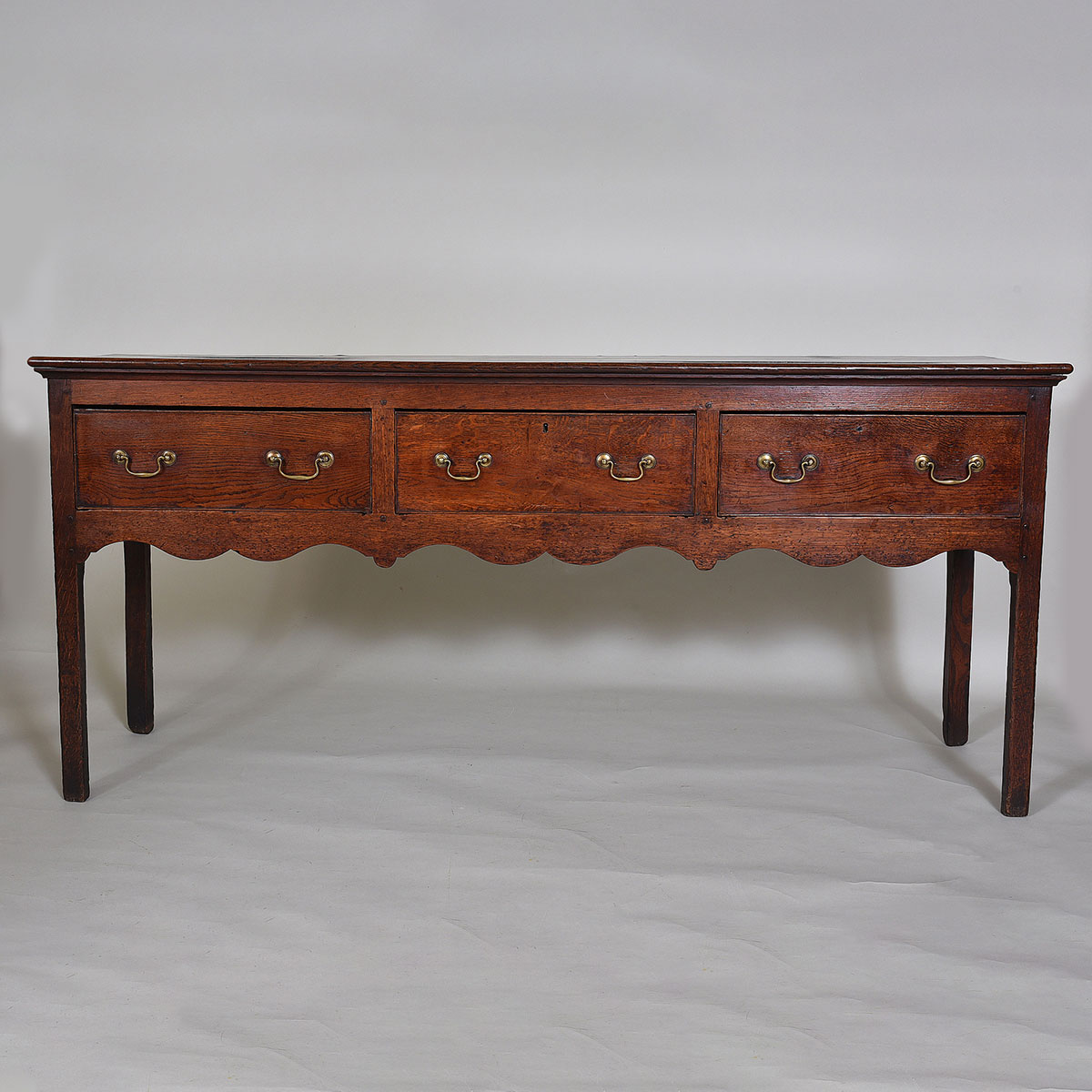 Late 18th century Oak dresser with three drawers over a shaped frieze. Brass swan neck handles. Lovely faded colour and good patination. Circa 1780/90