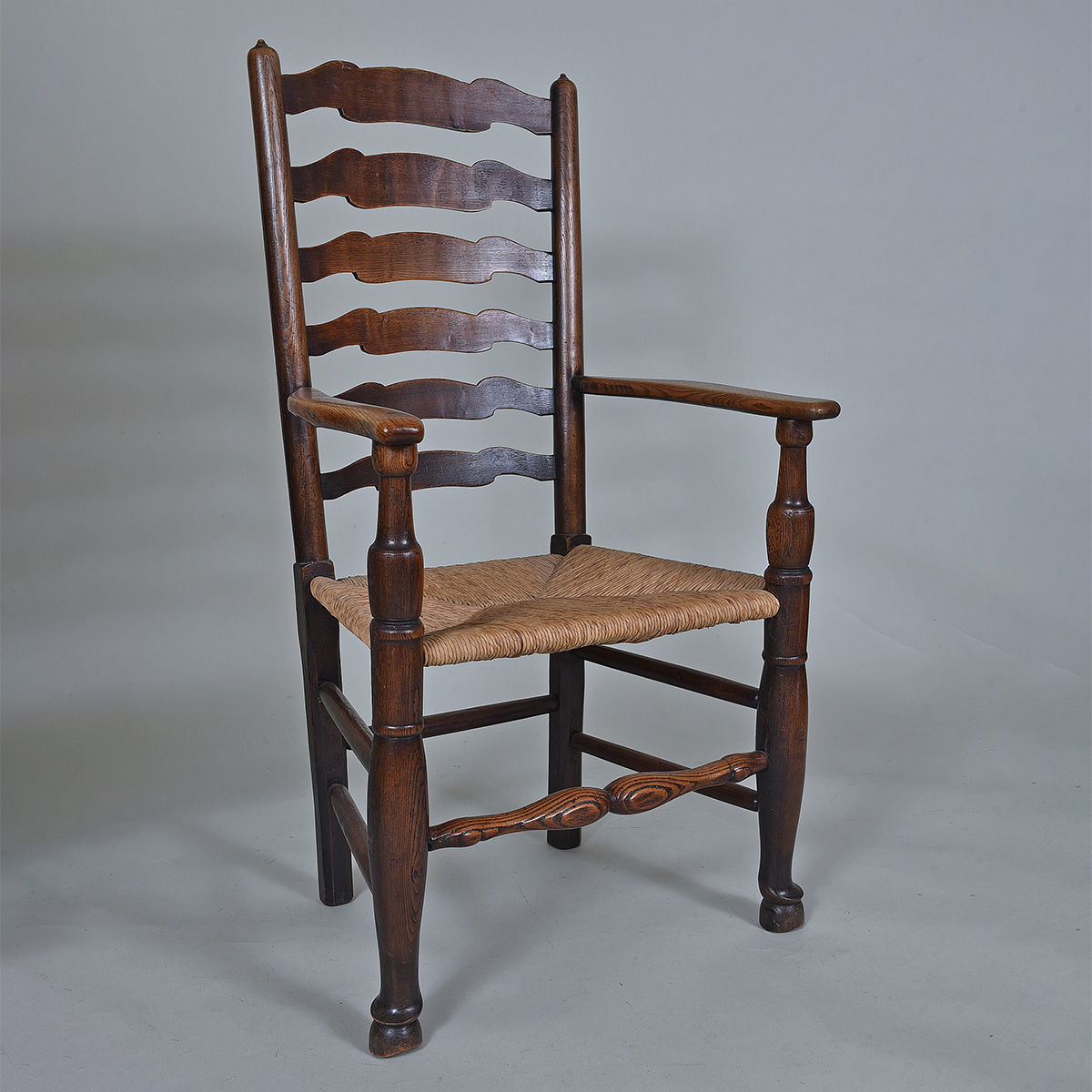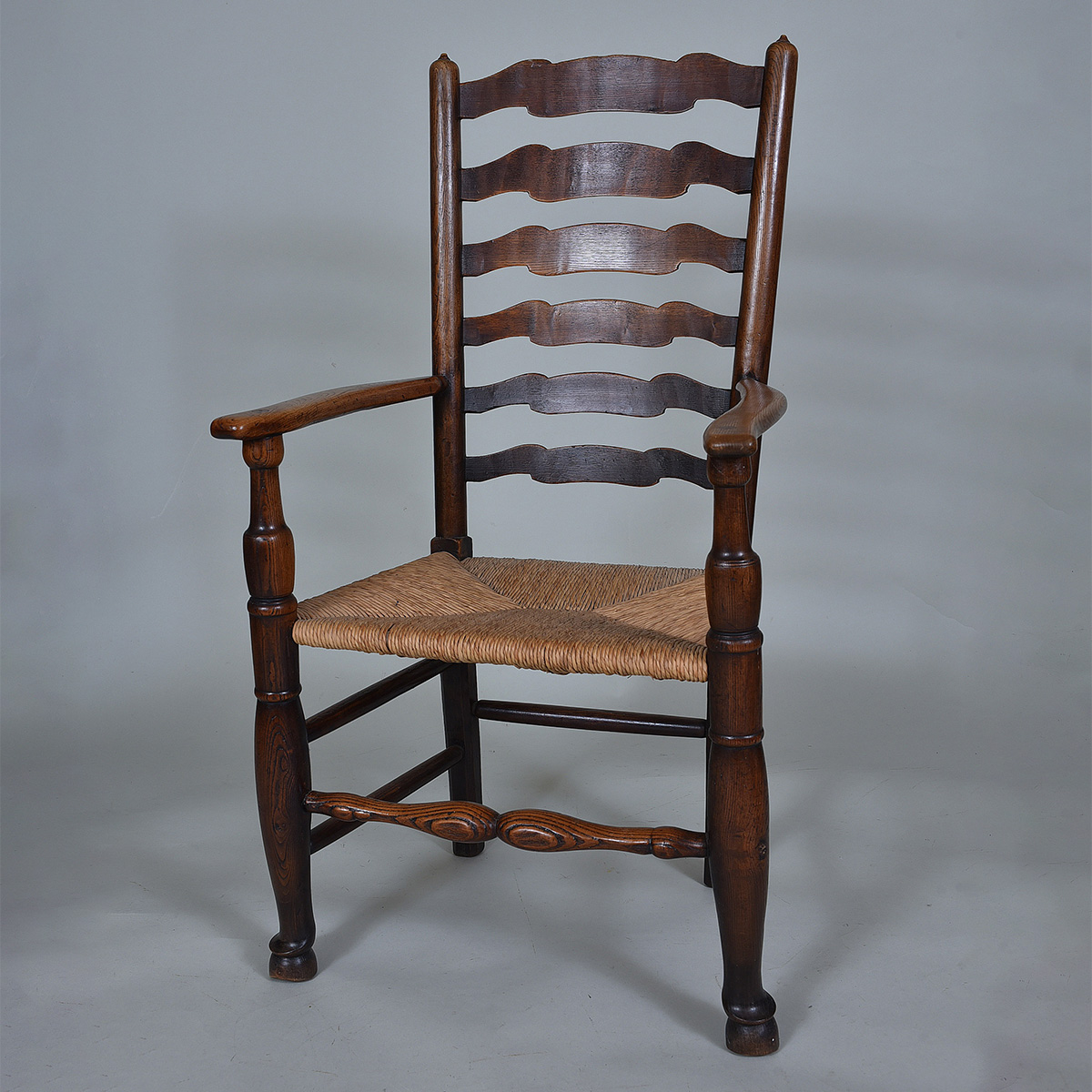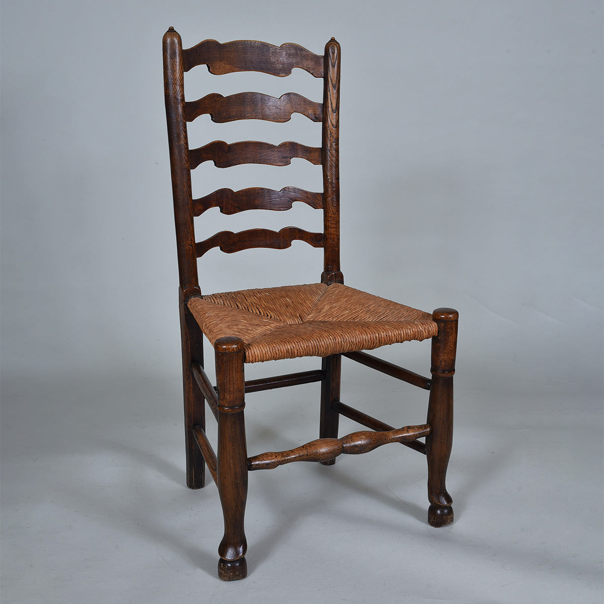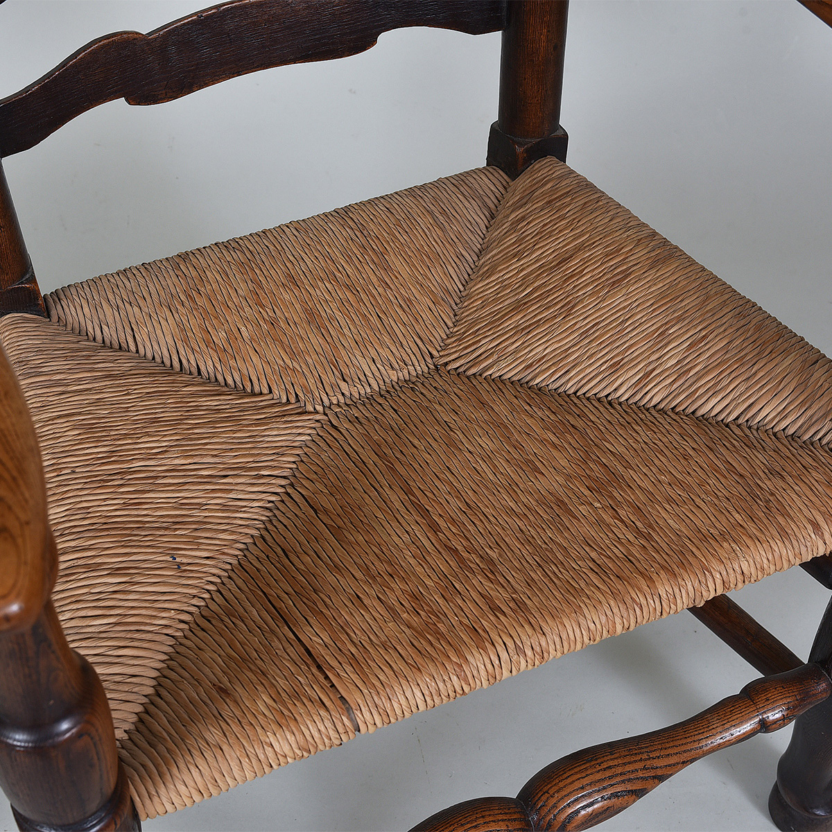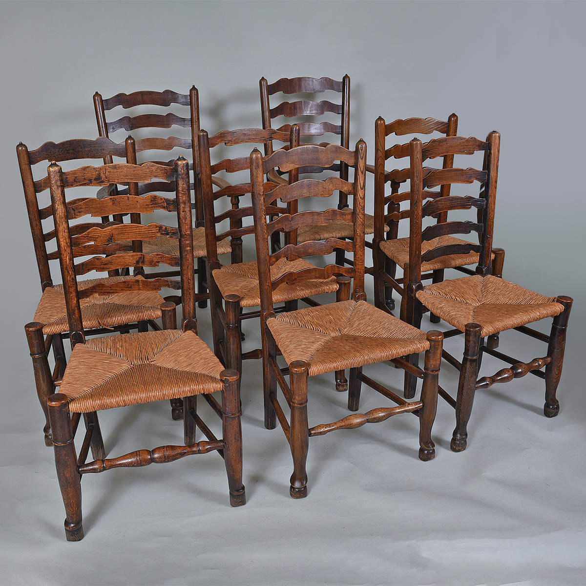 Set of 18th century Lancashire ladder back dining chairs with rush seats. Two armchairs and 6 single chairs.Circa 1790 Seat Height: 17.5″ / 45 cms