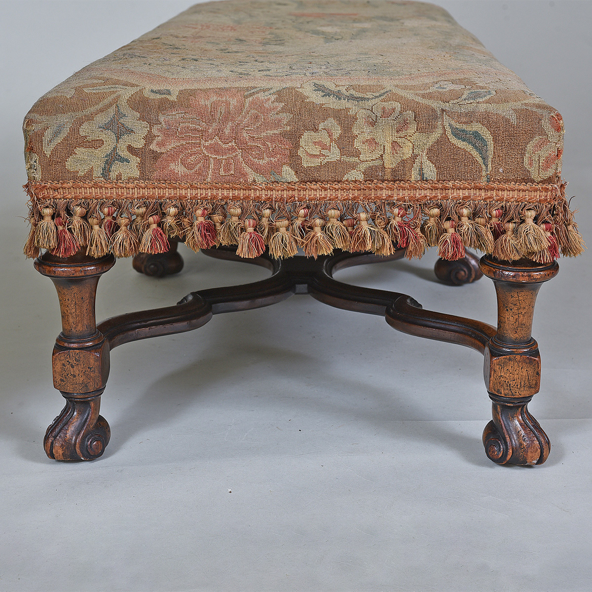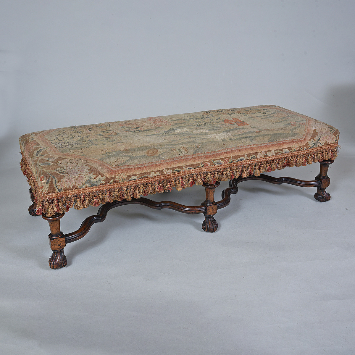 William and Mary STYLE long stool. Upholstered with Aubusson tapestry. Width: 45″ / 114 cms Depth: 18″ / 46 cms Height: 13″ / 33 cms